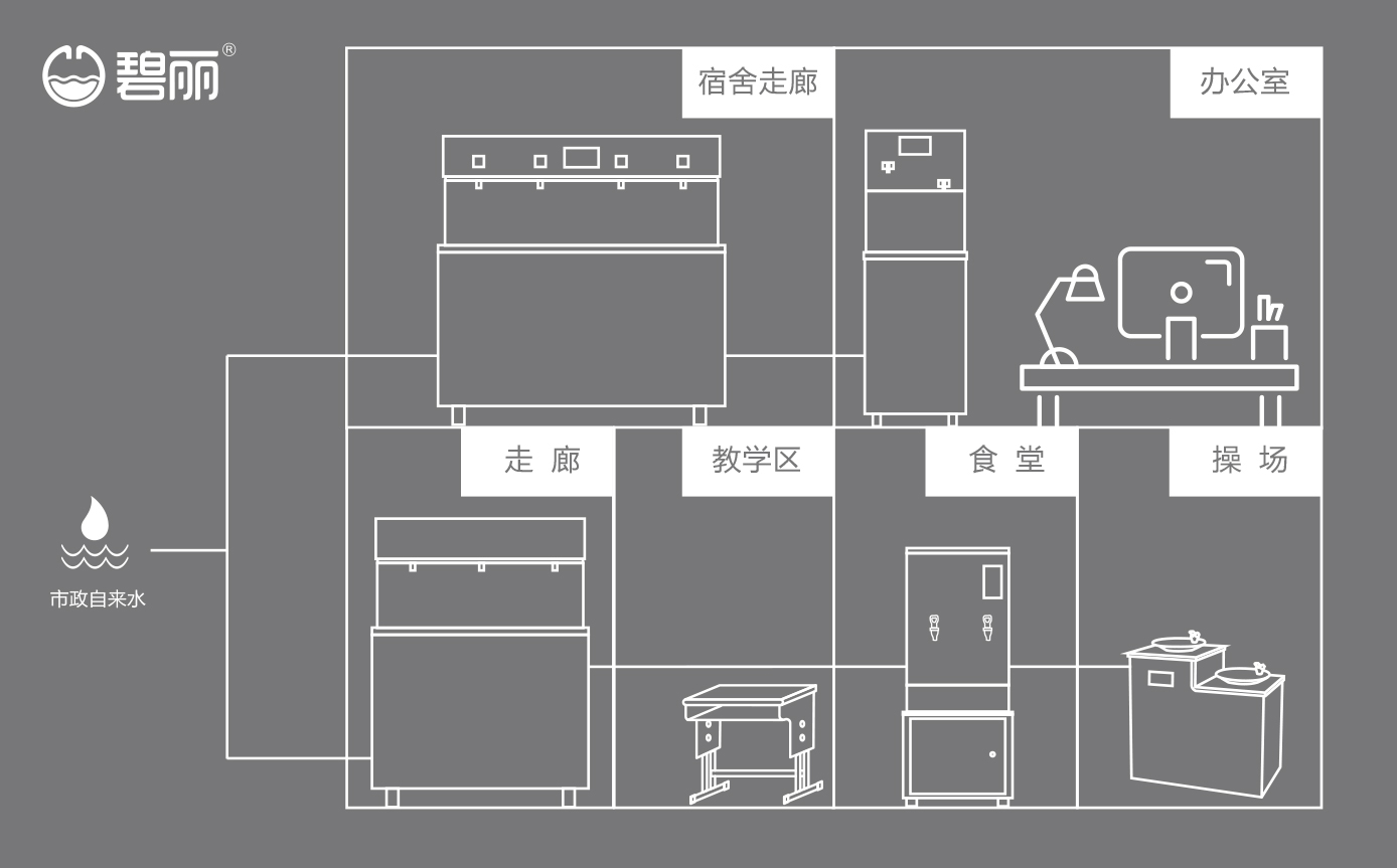 不同的飲水點(diǎn)可根據(jù)實(shí)際情況選擇設(shè)備使用方案,如辦公室可安裝管線機(jī)或飲水設(shè)備或開水器,使用戶能喝上開水、溫開水、純凈水等,來滿足不同場景的飲水需求;