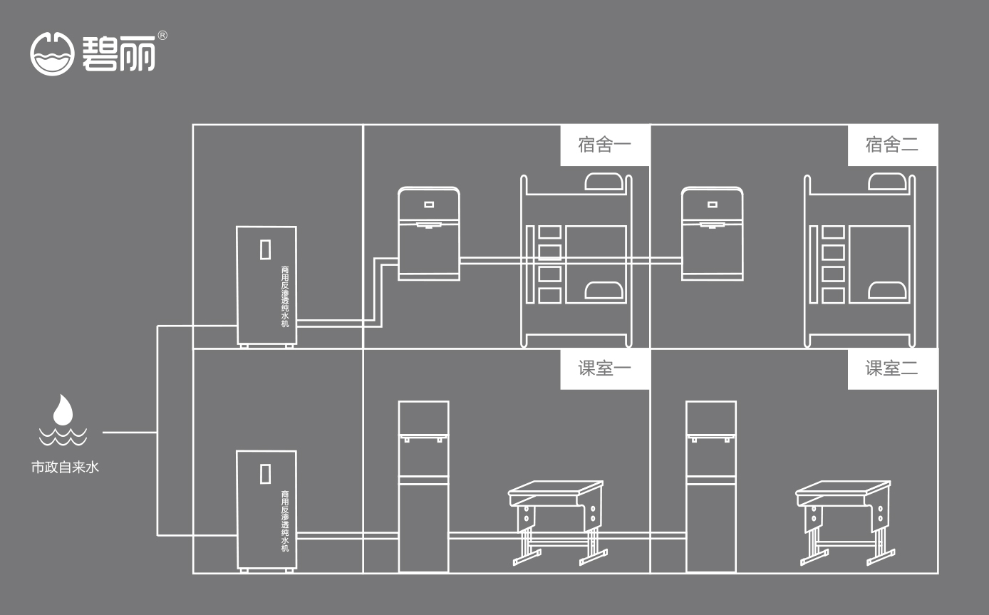 碧麗商用反滲透純水機(jī)將自來水集中處理后,把優(yōu)質(zhì)的純凈水通過專用的供水管道輸送到各飲水點(diǎn);