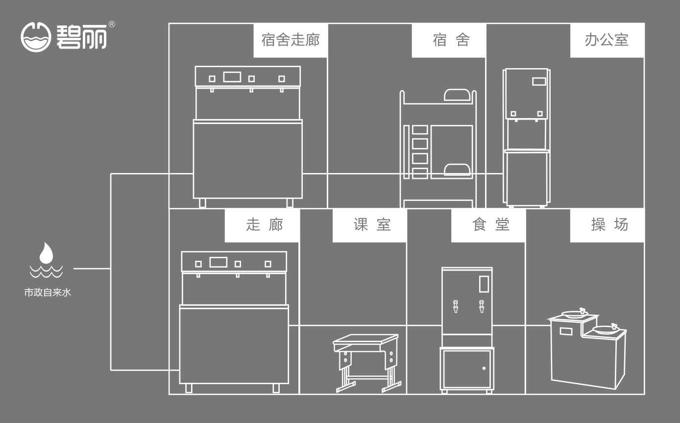 不同的飲水點(diǎn)可根據(jù)實(shí)際使用情況,安裝管線機(jī)或飲水設(shè)備或開水器,使用戶能喝上開水、溫開水、純凈水等,來滿足不同場景的飲水需求;