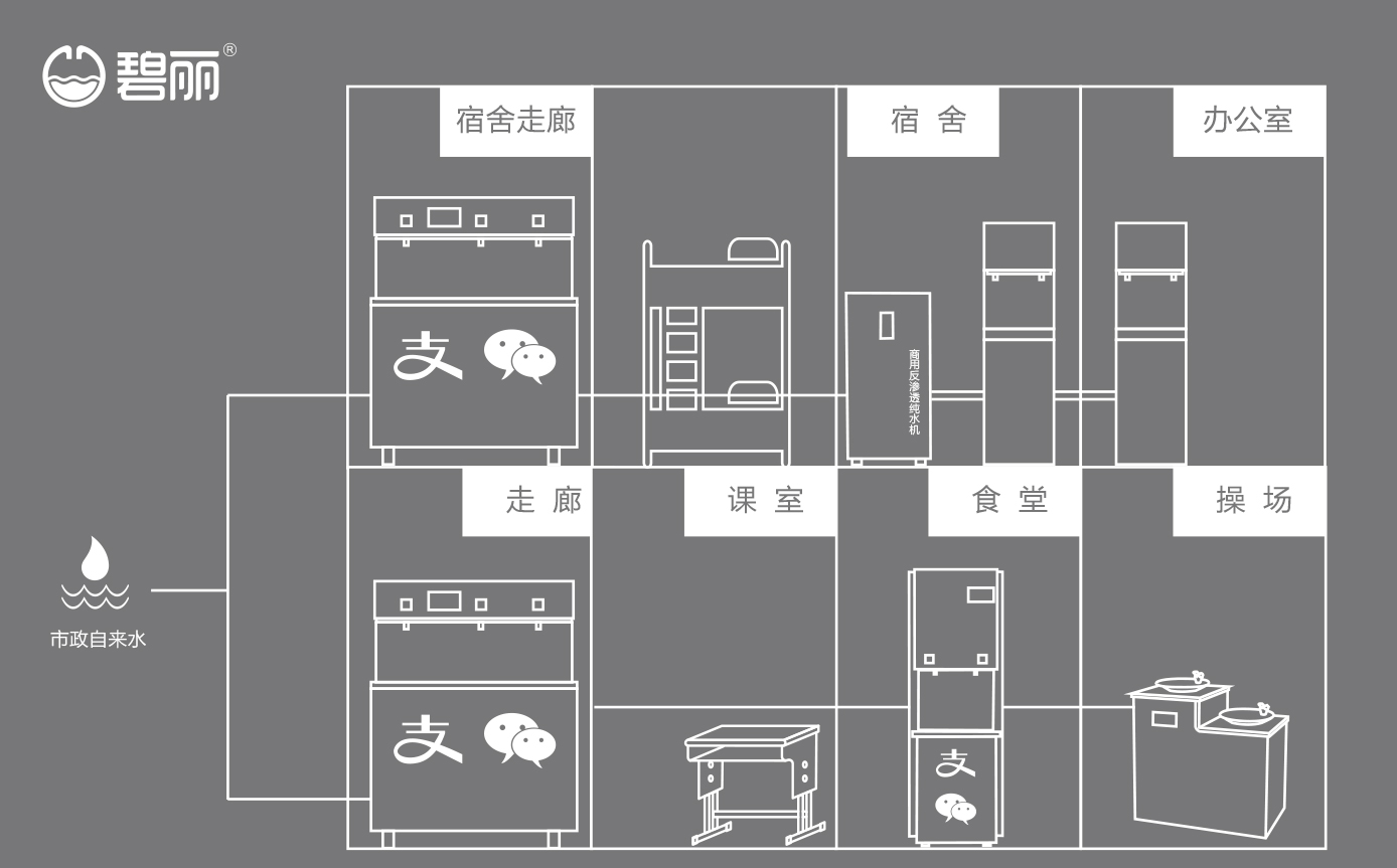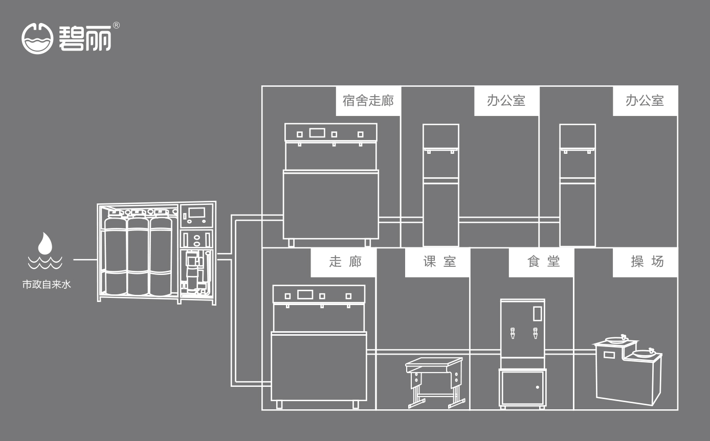 碧麗大型反滲透純水設(shè)備將自來水集中處理后,把優(yōu)質(zhì)的純凈水通過專用的供水管道輸送到各飲水點(diǎn);