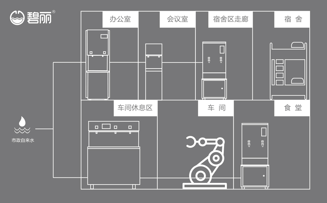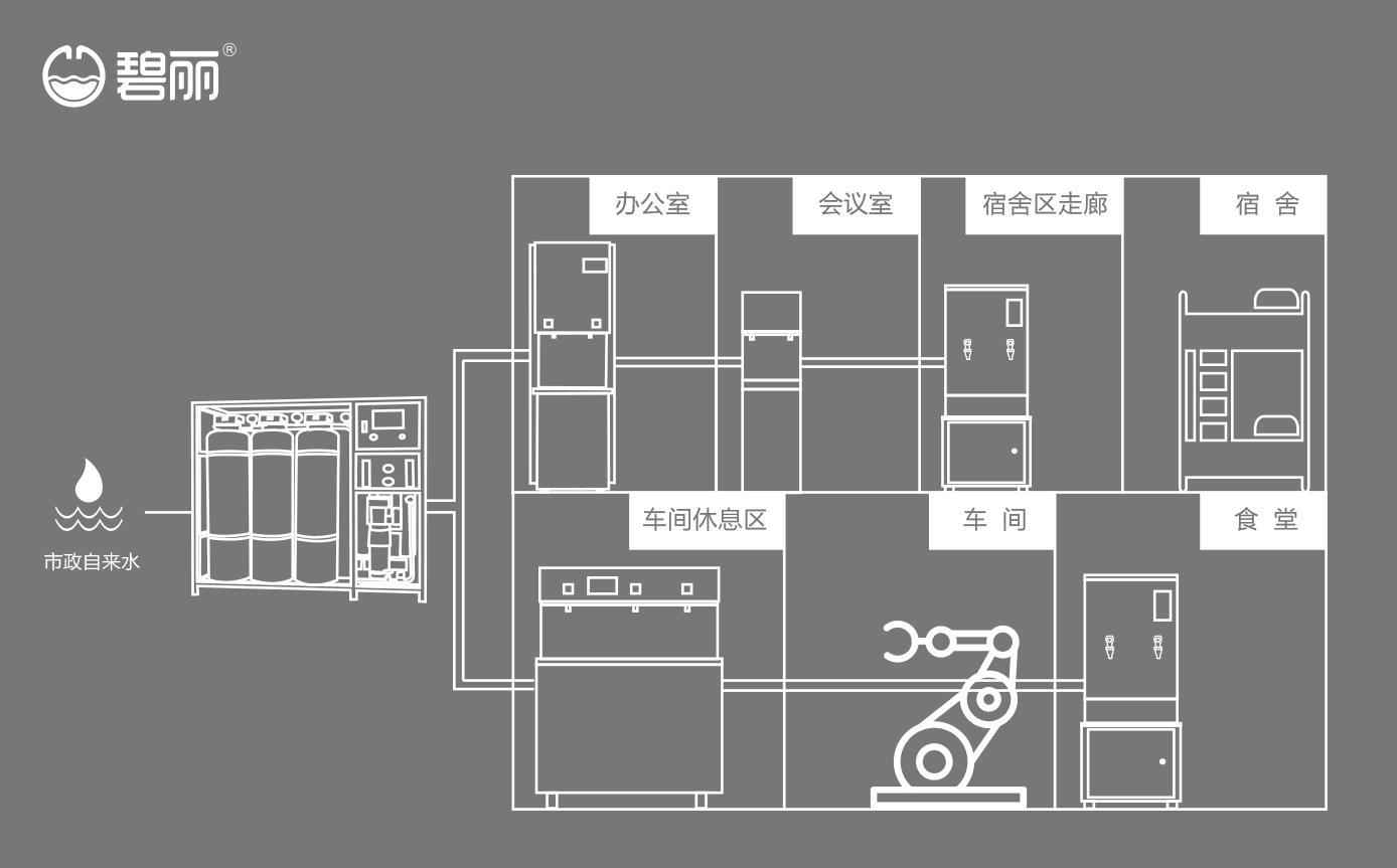碧麗商用反滲透純水機(jī)將自來(lái)水集中處理后,把優(yōu)質(zhì)的純凈水通過(guò)專(zhuān)用的供水管道輸送到各飲水點(diǎn);